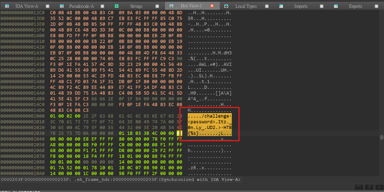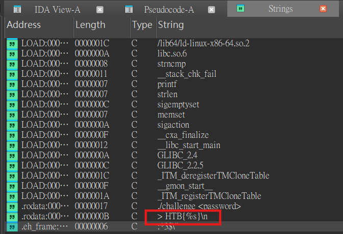./challenge <password>It tell us we should put some password as the argument to execute this. Next step, I check the printable strings in the binary by using strings or the strings tab in IDA.